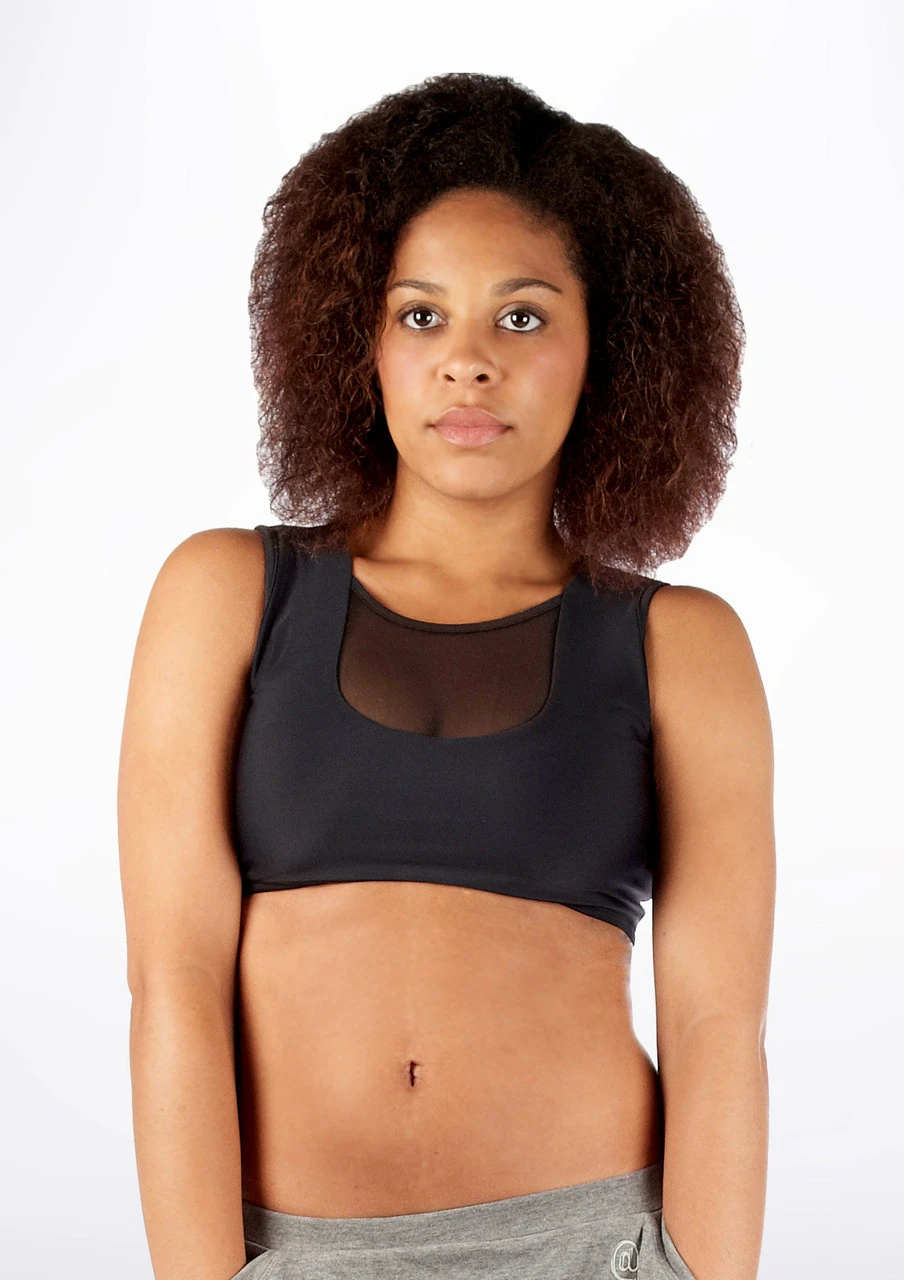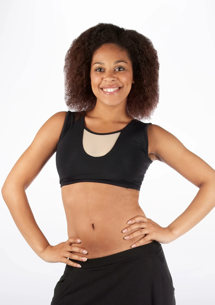 A gorgeous fitted black crop top with mesh panel details on the front and back. This crop top is completely waterproof and is ideal for various styles of dance.