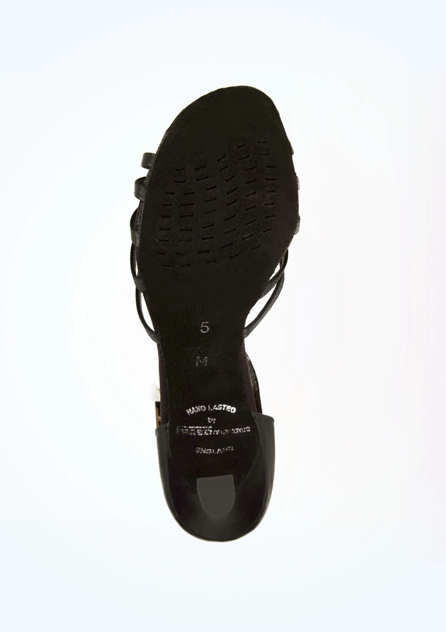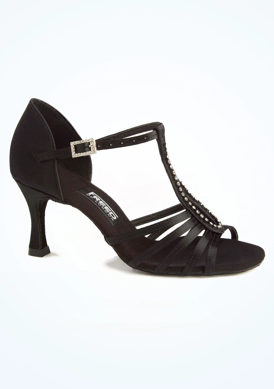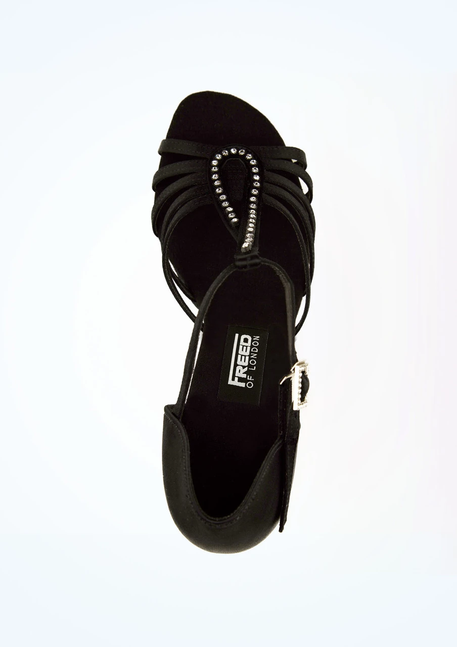 A unique style ballroom, latin and salsa shoe from Freed. The black PU upper features a loop style design with diamante detail up the foot. and the t-bar style strap ensures a secure and comfortable fit.