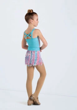 -Pull-on sequin and stretch fringe skirt with jeweled feather at the waist