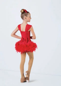 -Pull-on shiny spandex jazz skirt has a back bow and feather boa trim