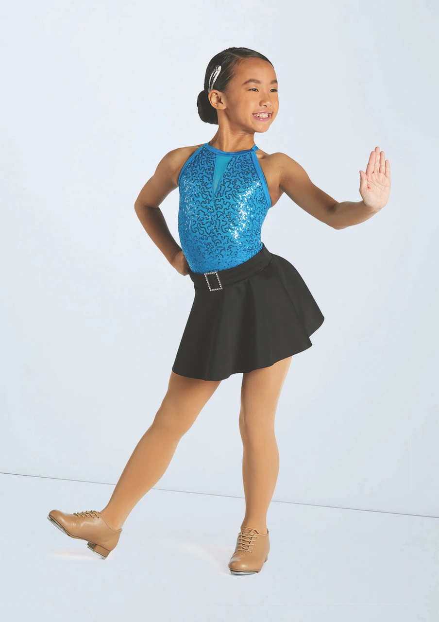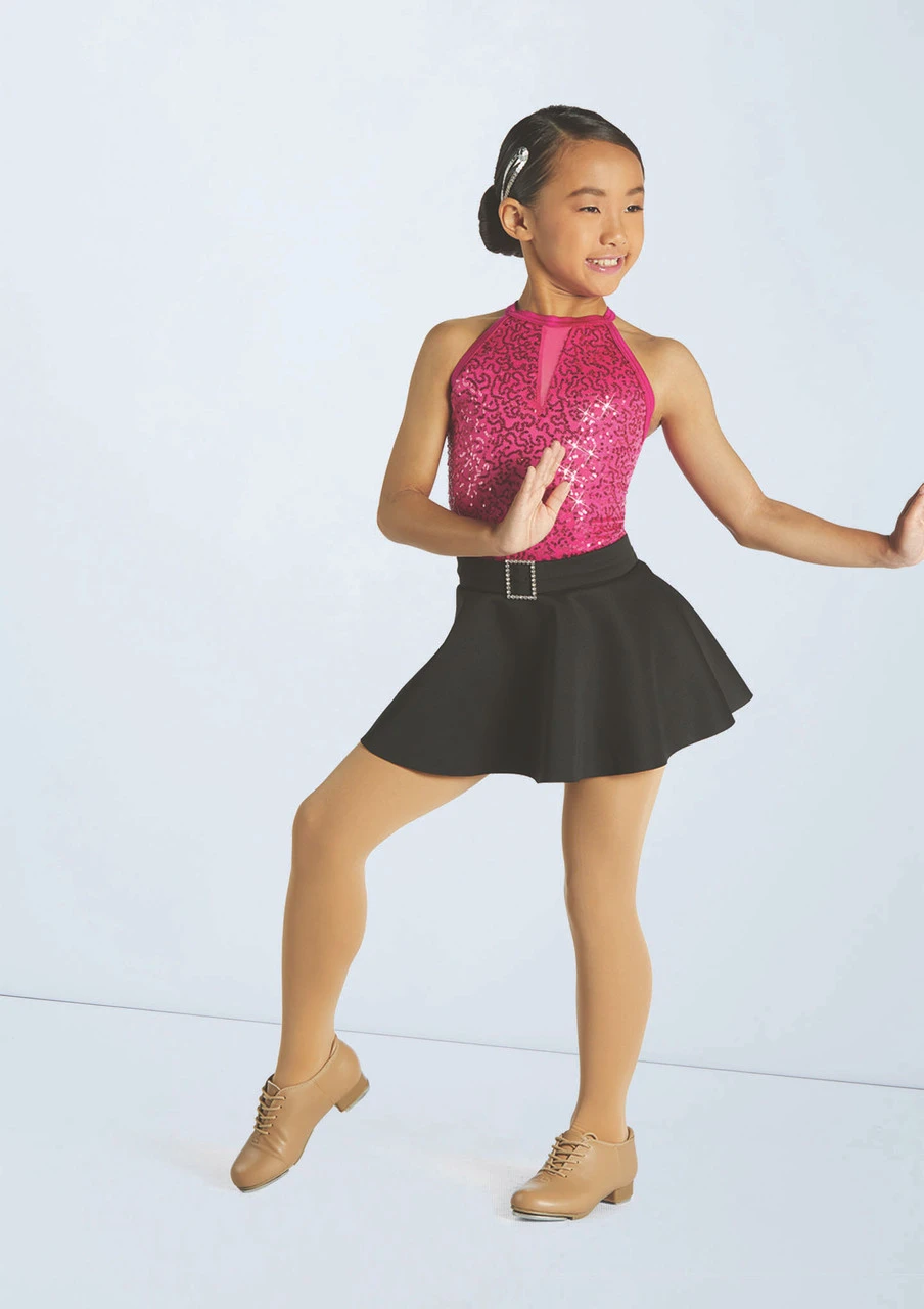 Pull-on skater skirt is neoprene with rhinestone buckle