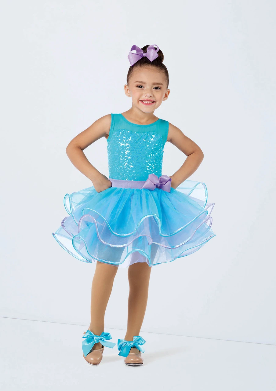 -Iridescent glitter ribbon bow at the shiny spandex waist